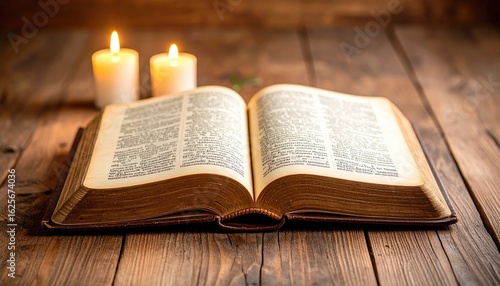 © amankris99, Obraz premium Open Book with Soft Candlelight on Rustic Wooden Table Surface