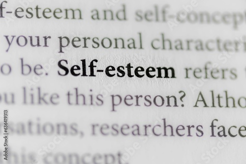 © Jon482/Wirestock Creators, Obraz premium Open book with the word 'Self-Esteem' written on the page in bold, black lettering
