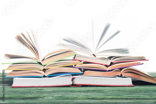 © LIGHTFIELD STUDIOS, Fototapeta premium Open books stacked on wooden table