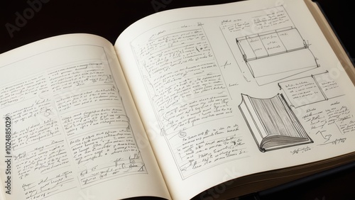Fototapeta premium Open books with handwritten notes. An open book with handwritten notes, sketches, and diagrams reflecting a creative process, possibly related to book design. The scene evokes craftsmanship.