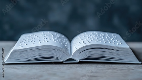 © Design By Reiga, Obraz premium Open braille book on table, close-up.