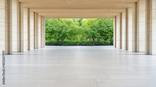 © siraphol, Fototapeta premium Open corridor limestone colonnade minimal architecture framed greenery serene