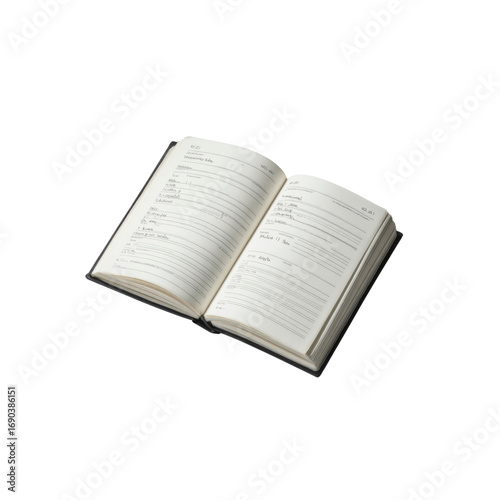 © Mekunama, Obraz premium Open Daily Planner Notebook with Handwritten Notes and Appointments