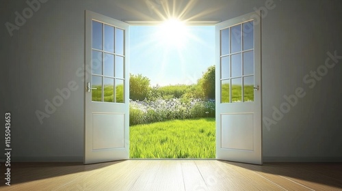 © Alfath, Obraz premium Open door revealing sunny garden.
