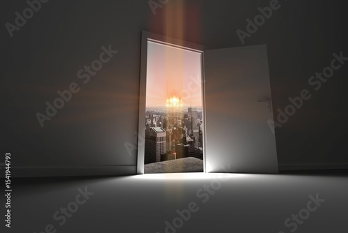 Naklejka premium Open door with cityscape and orange lens flare