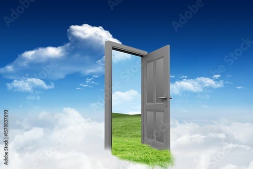 Obraz premium Open door with grassy landscape against sky
