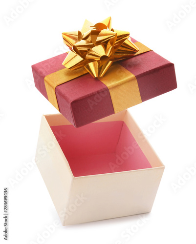 © New Africa, Naklejka premium Open empty gift box with bow on white background