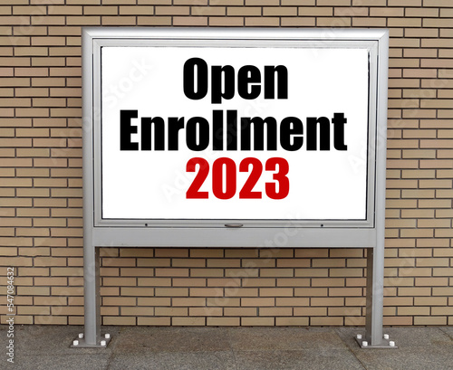 Fototapeta premium Open Enrollment 2023 words on bulletin board.