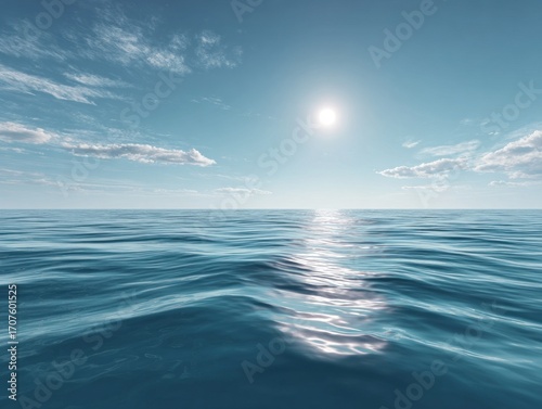 © gina, Fototapeta premium Open expanse of shimmering ocean under a bright sun with wispy clouds dotting a serene, clear sky. Water reflects sunlight