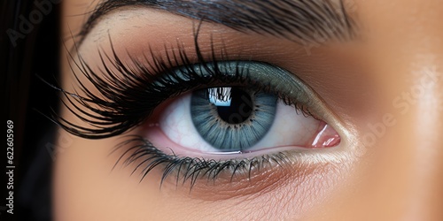 © OP38Studio, Obraz premium Open female green eye with makeup with brown eyebrows and black lashes, generative ai