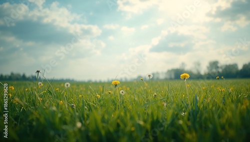 Fototapeta premium Open field featuring lush grass and blooming dandelions, ideal for nature-themed design or editorial use, Earth Day