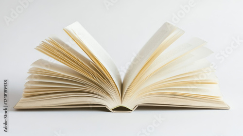 © Sehraye, Obraz premium Open fly school paper book vector illustration isolated on white background. Publish novel story with green cover after imagination wind in bookstore. Education dream design with clean text space.
