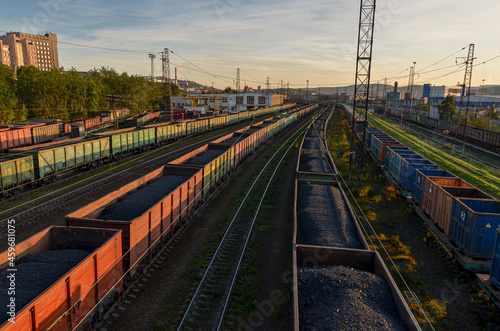 © ssmalomuzh, Fototapeta premium open freight cars with coal at railway station in Murmansk, Russia
