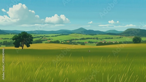 © Mazayshop, Obraz premium Open grassland with distant mountains generated AI