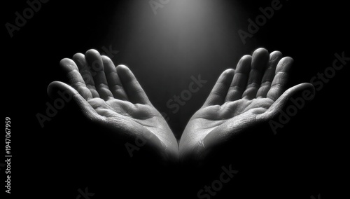 © Ariansyah, Fototapeta premium Open Hands Reaching Upwards in Dramatic Spotlight.