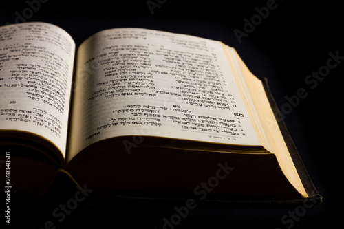 Fototapeta premium Open hebrew Bible, isolated on black background, with side lighting