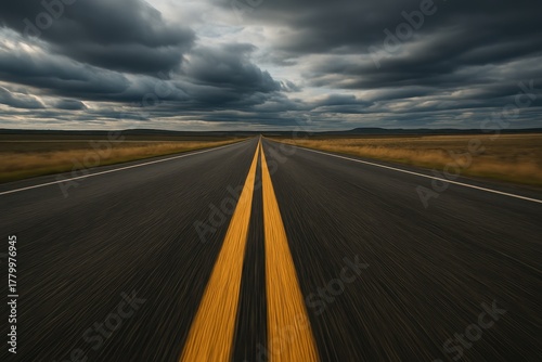Naklejka premium Open highway to the horizon under dramatic cloudy sky travel freedom perspective