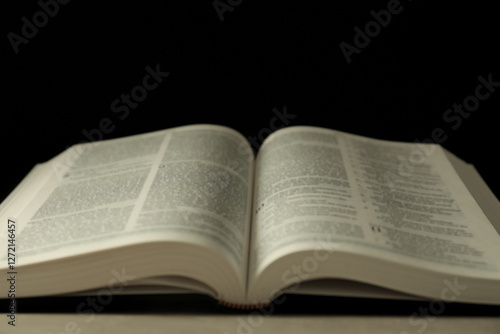 © New Africa, Obraz premium Open Holy Bible in English language on grey table, closeup