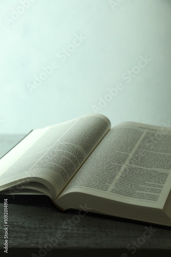 © New Africa, Obraz premium Open Holy Bible in English language on wooden table, closeup. Space for text