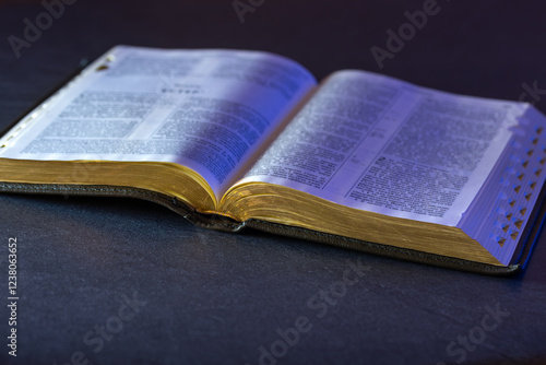 © puhimec, Obraz premium Open Holy Bible on the table. Religion concept. Bible on black background.