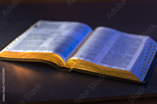 © puhimec, Obraz premium Open Holy Bible on the table. Religion concept. Bible on black background.