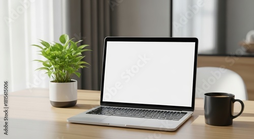 © photoplotnikov, Fototapeta premium Open laptop on desk with potted plant and black mug in bright room
