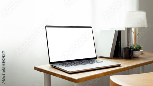 Fototapeta premium Open laptop with blank screen on a wooden desk in a kitchen room home office.