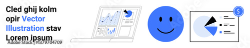 Fototapeta premium Open laptop with graphical charts, blue happy face, and pie chart in business document. Ideal for data analysis, finance, productivity, business review, presentation, strategy simple landing page