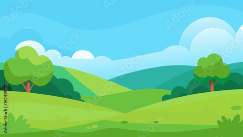 © Anondo, Fototapeta premium Open Meadow Scene in Vector Art Style with Distant Trees and Sky