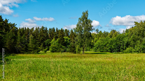 © Igor, Fototapeta premium Open Meadow Surrounded by Forest. Serene Nature View with Trees and Clouds.