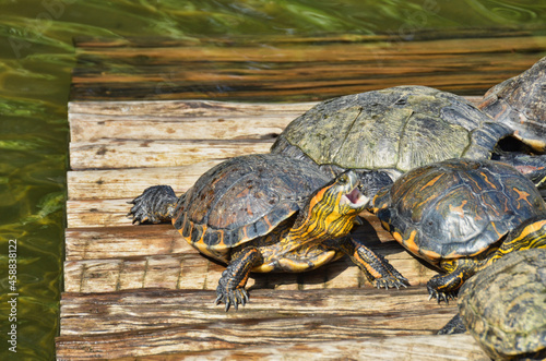 Obraz premium Open Mouthed Turtle on Turtle Pile on Wood Dock in Lake