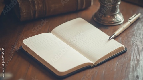 Fototapeta premium Open Notebook, Fountain Pen, Antique Setting - Cozy Writer's Desk