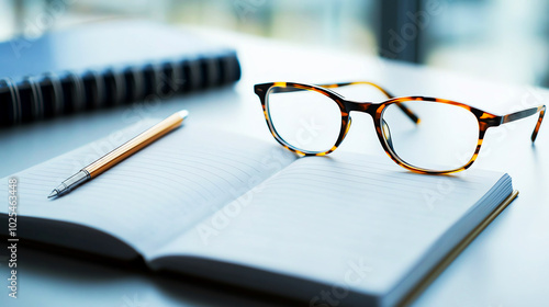 Fototapeta premium Open notebook with glasses and pen on desk, blurred background, concept of work and focus.