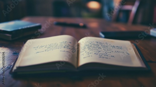 © Rere_Art151, Obraz premium Open Notebook with Handwritten Notes on Wooden Table