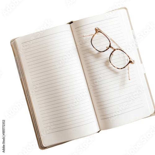 © Shazia, Fototapeta premium Open notebook with lined pages and eyeglasses perfect for planning journaling or note-taking isolated on white