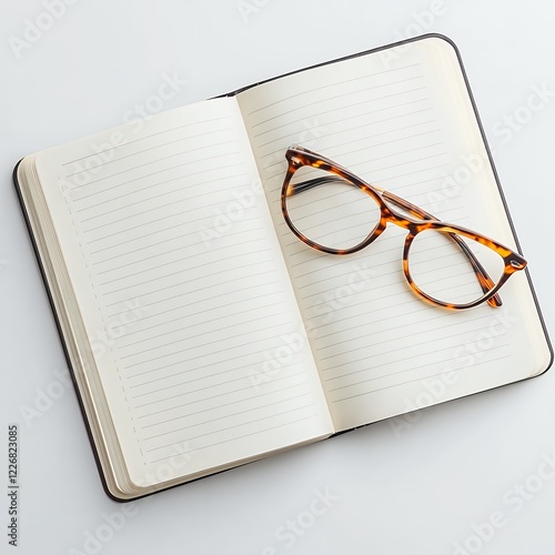 Fototapeta premium Open Notebook with Tortoiseshell Eyeglasses on White Background: Minimalist...