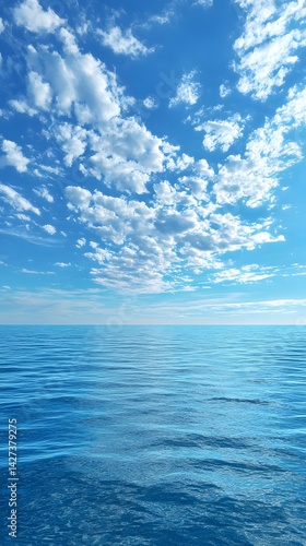 © EngineerJahid, Fototapeta premium Open Ocean Under Azure Blue Sky with Wispy White Clouds and Horizontal Ripples