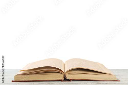 © New Africa, Fototapeta premium Open old hardcover book on wooden table