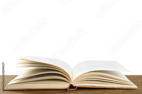 © New Africa, Fototapeta premium Open old hardcover book on wooden table