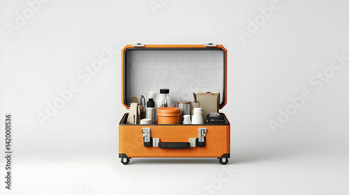 © predator, Fototapeta premium Open Orange Suitcase With Travel Items On White Background