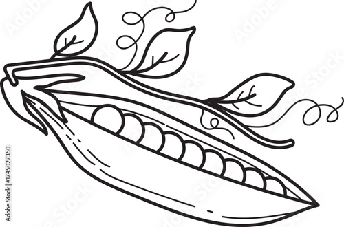 Fototapeta premium Open Pea Pod with Peas, Leaves, and Tendrils Line Art Illustration