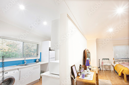 © JRstock, Fototapeta premium Open plan apartment with view of kitchen and bed