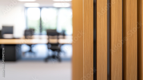 © Nakarin, Obraz premium Open plan office with wooden paneling and blurred background