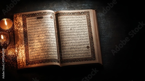 Fototapeta premium Open Quran with Arabic Text on Dark Surface and Candlelight Glow