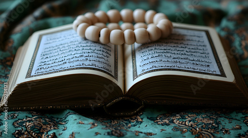 © suparti, Obraz premium Open Quran with wooden prayer beads on teal fabric. (1)