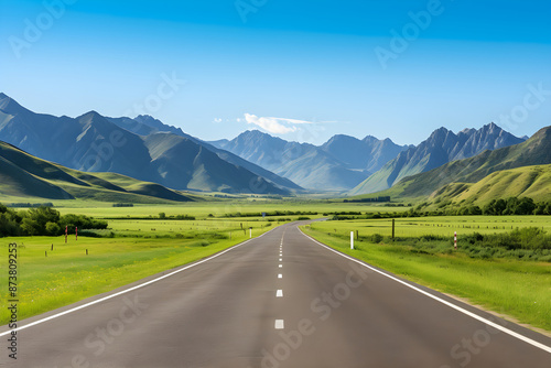 © Ethel, Fototapeta premium Open Road Adventure: An Inviting Asphalt Road to The Horizon Between Mountains and Blue Sky