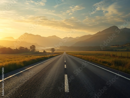 © JAKIRUL ISLAM, Fototapeta premium Open road leading towards majestic mountains at sunset