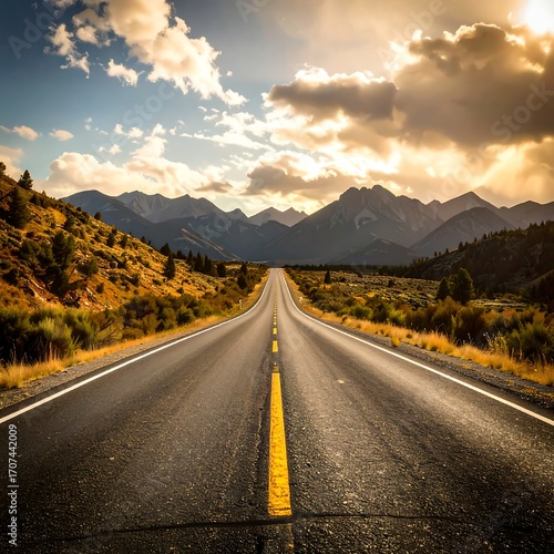 © Hambaa, Naklejka premium Open road stretching into a mountain range at sunset