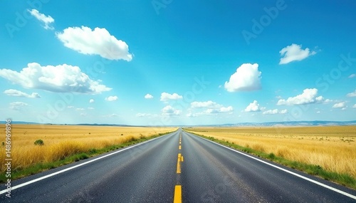 Fototapeta premium Open road stretching to horizon, vibrant blue sky, asphalt, destination