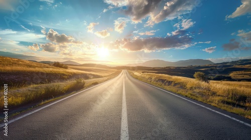 © Lull, Fototapeta premium Open road sunset landscape. Scenic view of an empty asphalt road leading towards a beautiful sunset over rolling hills and golden fields.